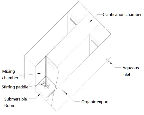The extractant and feed liquid enter the submersible chamber or manifold from the bottom of the extraction tank in a certain proportion. They are then drawn into the mixing chamber by a wheel-type agitator and sheared and mixed to disperse them. At this time, the two liquid phases are fully mixed, allowing the solute to be transferred from one liquid phase to the other, thus completing the mixing and mass transfer process.