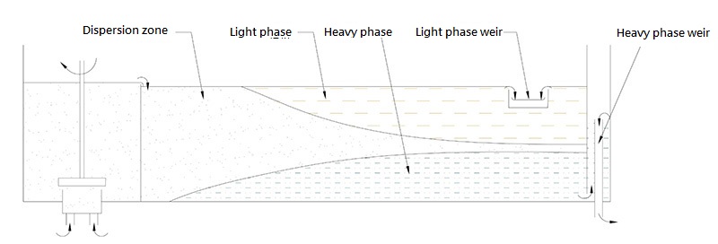 The mixture overflows from the mixing chamber to the settling chamber. Due to the difference in density between the two phases, they are separated under the action of gravity. The separated liquids flow out through the light and heavy phase weirs or enter the next stage.