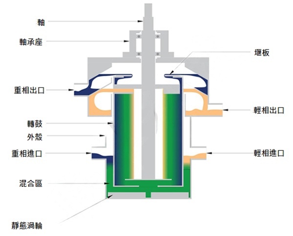 混合液在靜態渦輪的作用下進入轉鼓,在腹板形成的腔區內,混合液很快與轉鼓同步旋轉,在離心力的作用下,密度大的重相液在向上流動過程中逐步遠離轉鼓中心而靠向轉鼓壁;密度小的輕相液體逐步遠離轉鼓壁而靠向中心,澄清後的兩相液體最終分別通過各通道進入收集室並沿切線方形流出,完成兩相分離過程。