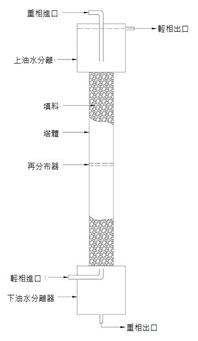 填料塔屬重力分散型萃取塔。塔內裝有填料,輕相從塔底進入、從塔頂流出,重相從塔頂流入、從塔底流出,兩相液滴在流動過程中被填料分散碰撞,從而達到傳質效果。常用的填料有拉西環、鞍形環、鮑爾環等。